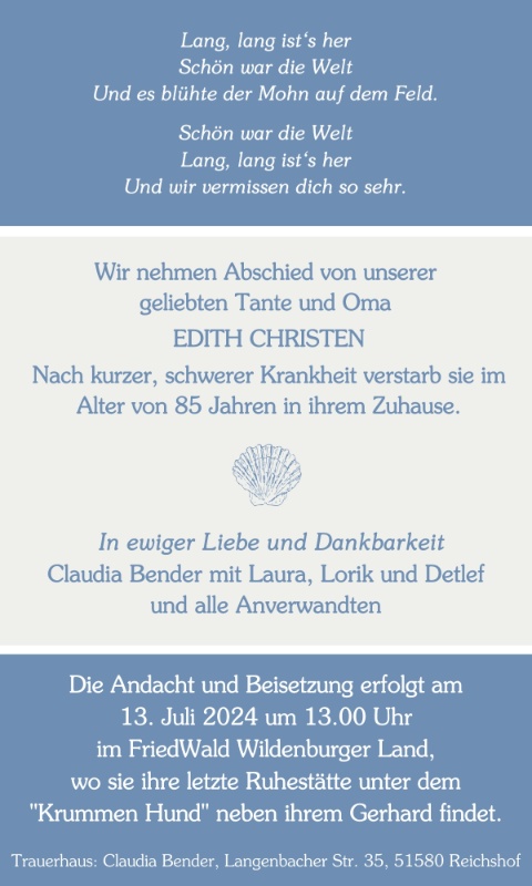 Meine liebste Tante Edith, es tut mir so furchtbar leid, dass du nicht mehr bei uns bist. Aber so schwer es für uns auch ist, so ist es auch eine Erleichterung zu wissen, dass dein Schmerz, dein Sehnen und deine Trauer nun vorbei ist und du mit Onkel Gerhard wieder vereint bist.